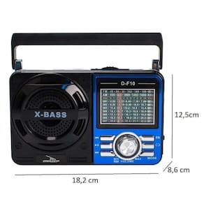 Radio caixa de som retro d- f10 - grasep caixa de som retro grasep d-f10 rádio estilo retro, entrada para pendrive e cartão de memória. Possui uma ótima captação de rádio am/fm. Som hi-fi de alta qualidade. Fácil utilização, é portátil podendo ser transportado para vários lugares, acompanha uma alça para o transporte. Pode ser utilizado diretamente na tomada 110/220v, ou fora dela, com sua bateria recarregável de ótima autonomia. Especificações: potência: 8w rms. Capacidade da bateria interna: 1200mah. Frequência de resposta: 150 20000hz. Sensibilidade: 80db. Impedância: 8 ohms. Diâmetro do alto-falante: 75mm. Dimensões: comprimento:18,2cm largura: 8,6cm altura: 12,5cm