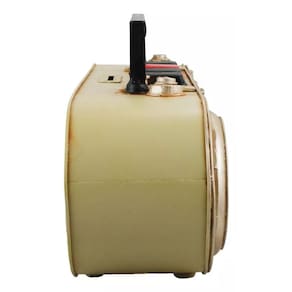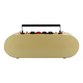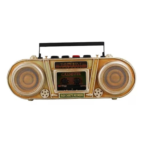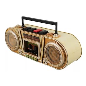 Enfeite decorativo em forma de uma rádio bege com 16 x 9 x 36 cm de dimensão, detalhes e cores muito realista. É também um cofrinho porta moedas. Deposite a moeda no topo da rádio, e retire na base. Material: metal; Atenção: este produto tem apenas função decorativa, não é um brinquedo e nem uma rádio de verdade!