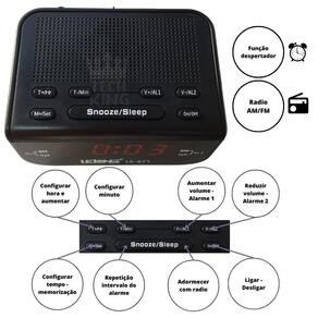 Usabilidade: Definição simples do relógio para configurar a hora e o alarme sem necessitar de instruções Possui regulagem de luminosidade Acorde ao som da sua estação de rádio favorita ou de um alarme Temporizador para adormecer ao som da sua música favorita Repetição do alarme para dormir mais um pouco Com o uso das pilhas você assegura a conservação da memória em casos de quedas de energia