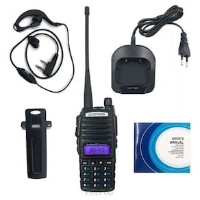 - produto: rádio comunicador baofeng - modelo: uv-82 - cor: preto - memória: 128 canais - alcance: até 12 km em campo aberto - potência de saída: 5w - voltagem: dc 7.4v - bateria interna de lítion 2800mah - modelo da bateria: bl-8 - duração da bateria: cerca de 12 horas - tempo de carregamento: aproximadamente 5 horas - temperatura de operação: -20c60c - consumo: 380mah - estabilidade de frequência: 2.5 ppm - impedância da antena: 50 ohm - modo de operação: simples ou semi-duplo - range de frequência: 65mhz108mhz recepção rádio fm - frequência: Vhf: 136mhz - 174mhz Uhf: 400mhz- 520mhz - resposta especulativo: 60db - potência de saída de áudio: 1000mw
