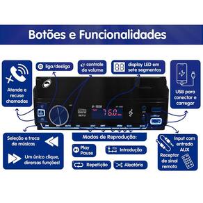Apresentamos o seu companheiro de viagem definitivo para uma experiência musical excepcional. Com controle remoto, você pode desfrutar de músicas armazenadas em cartão micro sd, bluetooth e via usb. Sintonize e equalize o som conforme suas preferências. Complementado por um display de led, controle remoto e muito mais, é ideal para viagens com estilo e música.