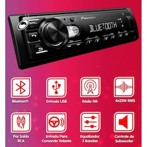 Rádio Pioneer Mvh-S235Bt Som Automotivo Usb Bluetooth 4 Canais Descrição: O mvh-s235bt é resultado da combinação dos melhores recursos das gerações anteriores de sucesso como o mvh-s218bt, mvh-s118ui e mvh-98ub. Com a tecnologia bluetooth você pode curtir as suas músicas e podcasts favoritos pelos aplicativos de celulares e realizar chamada telefônica hands-free. Agora, se você é daqueles que prefere ouvir músicas por pendrive ou rádio fm, o aparelho também oferece esses recursos. Um dos grandes diferenciais deste modelo é a incrível qualidade sonora, equalizador de 5-bandas, corte de frequências, função bass boost reforço de graves e um som muito mais potente. Sim, trata-se da famosa qualidade de som pioneer Por fim, para atender aos pedidos dos consumidores, foi adicionado ao modelo a entrada de comando de volante. Com isso, o aparelho se torna muito versátil nas aplicações. Principais características: - bluetooth para ligações hands-free e streaming de áudio; - entrada usb; - rádio fm; - equalizador de 5-bandas; - função bass boost reforço de graves ; - 1 par de saída rca pré-amplificadas 2v ; - entrada para comando de volante. Display: - display: 12-caracteres va lcd; - iluminação dos botões: branca; - ajuste de dimmer: sim. Bluetooth: - conexão bluetooth: versão 5.0; - perfil bluetooth: hfp / a2dp / avrcp / spp; - streaming de músicas: sim; - chamadas telefônicas hands-free: sim. Áudio: - potência nominal: 4 x 23w rms; - saída pré-amplificada: 1 2v ; - equalizador: 5-bandas; - crossover: fpa / fpb; - bass bost reforçador de graves : sim; - controle de subwoofer: sim. Mídias suportadas: - sistema de arquivo: fat12 / fat16 / fat32; - formato de áudio: mp3 / wma / wav / flac. Conexões: - porta usb: traseira máx 0.5a ; - entrada para comando de volante: 1; - microfone integrado: 1. Sintonizador fm: - bsm busca e sintonia automática de estações : sim; - memória para estações favoritas: 18 fm; - rds: sim; - rádio fm: 76 mhz 108 mhz faixa estendida . Geral: - idioma: português, inglês e espanhol; - relógio: sim; - fonte de alimentação nominal: 14,4v dc; - corrente máxima: 10a. : 1 ano de do fabricante; A não cobre erros de instalação ou mau uso. Itens inclusos: - pioneer mvh-s235bt; - cabo de alimentação; - kit de instalação; - guia de início rápido. No grupo carrosomshop pepe parts, entendemos a importância de um bom som no carro. É por isso que oferecemos os melhores produtos e acessórios automotivos para proporcionar uma experiência de condução mais divertida e confortável. Explore nossa loja e descubra uma variedade de produtos que vão desde rádios, alto falantes até multimídias. Encontre o que você precisa para transformar seu carro com a qualidade e a confiança do grupo carrosomshop pepe parts Junte-se a nós e experimente o compromisso do grupo carrosomshop pepe parts com a qualidade e a satisfação do cliente. Garanta seu rádio automotivo pioneer e curta suas músicas favoritas com estilo e potência Homologação Anatel: 038651811468 Ean: 7898588672244