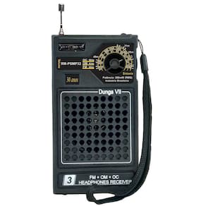 Características: Rádio Marca: Motobras Modelo: Dunga VII Referência de modelo: RM-PSMP 32 Potência: 300mW RMS Frequência: FM: 76 a 108MHz; AM: 520 a 1710KHz; OC: 5,80 a 12,10MHz Antena: Telescópica Alto falantes: 5,5cm - 8hms - 1W Alimentação: 4 pilhas pequenas -tipo AA- de 1,5 V -não fornecidas- ou fonte de alimentação 6VDC -Não fornecida-