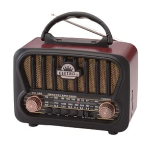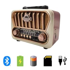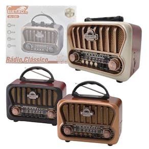 Código de barras: 7891123113110 Homologação Anatel: 169902214103 Rádio Retro 3W Bluetooth 5.1 com Lanterna Marca: Eletromex Este é um rádio estilo retrô, com Bluetooth, entrada para Pen drive e de memória. Ele é construído em matérias de alta qualidade, gerando um ótimo acabamento. Possui uma ótima captação de rádio AM/FM. Pode ser diretamente na tomada 110/220v, ou fora dela, com sua bateria recarregável de ótima autonomia. Descriçaõ técnica: - Tensão de saída: DC 3V - Potencia: 3W - Bateria Interna Recarregável - Tempo de Recarga: 8 Horas - Taxa de Ruído: 36dB - Bateria: 1200mAh - Frequência FM: 88-108 MHz - Sensibilidade FM: 15dB + 55dB - Taxa de Ruído FM: 45dB - Frequência AM: 530 1600 KHz - Frequência SW: 5.9 18.0 MHz - Entrada Para SD - Entrada USB - Com Lanterna de LED - 3 Bandas Itens Inclusos: - 01 Rádio Portátil - 01 Cabo de alimentação - 01 Manual de instruções Disponível nas cores: -Bege -Preto -Dourado Medidas da embalagem: L: 12,0 x C: 21,5 x A: 18,0cm Peso do Produto: 715g **Informar as cores desejadas no campo Observações