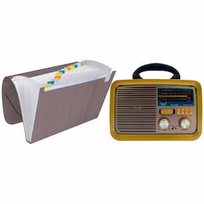 Radio Retro Portátil Vintage Am Fm Usb Pendrive Com Lanterna Pasta 12 Divisórias De Plastico Resistente Refroçada Kit com Rádio Retrô e Pasta Sanfonada: