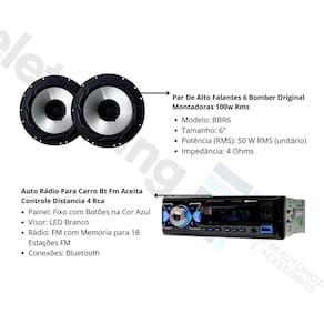 • Painel: Fixo com Botões na Cor Azul • Visor: LED Branco • Rádio: FM com Memória para 18 Estações FM • Controles: Graves, Agudos e Balanço dos Canais • Conexões: Bluetooth • Entradas: Micro SD, Auxiliar e 2 USB´s (1 Charger e 1 Player) • Saídas: 4 RCA • Tipo de Conector: ISO • Controle Remoto: SIM (Físico e por Aplicativo) • Potência: 4 Canais de 55 Watts RMS • Medidas Aproximadas (LxAxP): 18cm Largura x 10,5 Profundidade x 5cm Altur