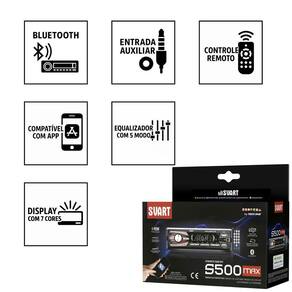 Rádio svart s500 max Atualize o som do seu carro com o rádio automotivo svart s500 max, ideal para quem busca qualidade, conectividade e praticidade. Com 90w de potência, o aparelho oferece som limpo e compatibilidade com diversos dispositivos. Equipado com bluetooth integrado, permite que você atenda chamadas em viva-voz e ouça suas músicas preferidas direto do celular. Conta com 2 entradas usb, entrada auxiliar p2 e leitor de cartão micro sd, garantindo múltiplas opções de conexão. O modelo ainda acompanha controle remoto e é compatível com o aplicativo e-way link, permitindo o controle total pelo seu smartphone android e ios . Além disso, seu display led com 7 cores ajustáveis traz um visual moderno e personalizável para o painel do carro. Especificações técnicas Potência rms: 50w Potência pmpo: 90w fm estéreo com sintonização eletrônica Frequência fm: 76.0 108.0 mhz Bluetooth com microfone embutido Mp3 player com id3 tag Display digital de led 18 estações de rádio predefinidas Funções: auto memory, scan, rpt, int, rdm, pau, mut com suporte a pastas 7 cores no display: vermelho, azul, roxo, verde, ciano, branco e amarelo Eac: auto, volume, bass, treble, balance, fader e loud Epq: pop, rock, class, jazz, flat Conector iso universal 2 pares de saídas rca Carregador usb: 1.5 1.7a Controle remoto incluso Modos de rádio: local / dx / estéreo / mono Volume: 0 a 40 Distorção: 38 Aplicativo compatível com android e ios Conteúdo da embalagem 1 rádio svart s500 max 1 chicote iso 1 grade de fixação1 controle remoto Manual do usuário Homologação Anatel: 063092211684