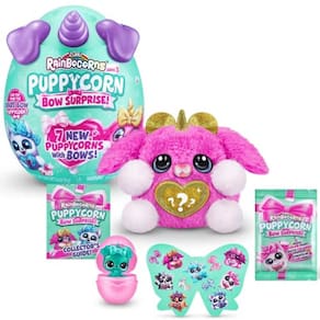 Conheça os Puppycorns mais lindos de Rainboville, Puppycorns Bow Surprise! Esses Puppycorns são apaixonados pela moda e mal podem esperar para serem seus novos amigos peludos! Use o coração Peel and Reveal para aprender o que seu amiguinho adora e abra o mini ovo Boo-Boocorn para conhecer seu mini eu! Há 5 surpresas embaladas dentro deste ovo de Rainbocorns, divirta-se para conhecer seu novo amigo curvado!