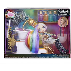 A lenda diz que no final do arco-íris, há um pote de ouro. Mas a verdade é que é algo ainda mais incrível. Apenas alguns escolhidos com um olho para modas os podem seguir o arco-íris até rainbow high, a escola de moda colorida onde todos aprendem a ostentar suas verdadeiras cores. Dê ao cabelo uma maquiagem de arco-íris com linda espuma de cabelo arco-íris. O Rainbow High Salon inclui espumas coloridas de cabelo laváveis para você e sua boneca. A linda pia do salão arco-íris é uma verdadeira estação de lavagem de cabelo que pulveriza água! Misture a cor das garrafas incluídas e pós de espuma com água do real, trabalhando pia para criar um arco-íris de espumas coloridas de cabelo. Use a escova incluída para adicionar cor o ao cabelo de suas bonecas e ao seu cabelo! Também inclui glitter de cabelo para adicionar brilho ao seu cabelo arco-íris. Quando você terminar, a cor é facilmente lavável, para que você possa enxaguar e repetir para criar olhares arco-íris de novo e de novo. Inclui: pia de salão arco-íris de trabalho, cadeira de salão, 5 garrafas ativadora de espuma, 5 pós de espuma, 1 glitter de cabelo, 1 escova de tonalidade, 1 colher, 1 tigela e 1 escova de cabelo. Boneca vendida separadamente.