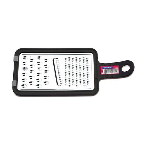 Ralador com lâmina com três diferentes opções de corte. Lâmina com dentes em escala maior, para melhor eficácia no manuseio. Cabo com design diferenciado e detalhes ranhurados, proporcionando maior firmeza e segurança no manuseio, com furo passante para pendurar o utensílio. Com um design moderno, permanece bonito por muito mais tempo.
