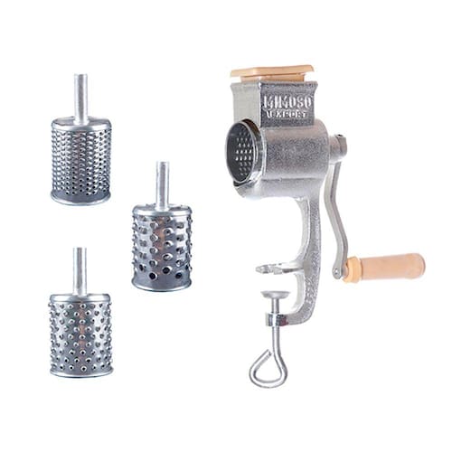 Máquina de ralar coco e queijo.O ralador de coco e queijo multiuso com 3 ralos da Mimoso é de fácil manuseio. Ele possui sistema de fixação prática que permite travar o ralador em qualquer superfície plana. É uma máquina de ralar alimento, segura e higiênica. Feita para quem precisa de agilidade na hora de ralar os alimentos. Suas peças podem ser desmontadas e lavadasUtilizado: ralar coco, queijos, legumes, sabão caseiro pedra e outros.DIMENSÕES:Peso = 2200g,Copo de entrada 45x55mm.CARACTERÍSTICAS TÉCNICAS:Corpo e manivela em ferro fundido estanhado. Ralo em folha de flandres. Soquete em polietileno injetado.ACOMPANHA:3 ralos, para espessuras: Pó, filete e lasca.