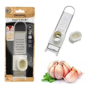 Ralador E Fatiador De Alho Gengibre Castanhas Em Aço Inox O ralador e fatiador de alho é produzido em aço inox de alta resistência e durabilidade, acompanha recipiente com tampa que protege os dedos ao ralar ou fatiar. Ideal para alimentos pequenos como gengibre, noz moscada, chocolate e amêndoas, além do tradicional alho e cebola. Cuidados: Para manter seus utensílios sempre brilhando, lave com esponja macia, sabão ou detergente neutro. Produtos abrasivos como palha de aço podem riscar e prejudicar o brilho Seque imediatamente para evitar manchas Recomenda-se o uso de água quente para melhorar o brilho Não guarde em local úmido, a umidade pode provocar manchas Aço Inox Lâmina multifuncional Fatiador e ralador