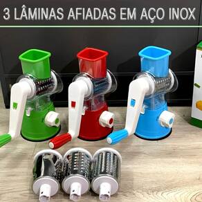 • 1 Ralador Fatiador De Legumes • 3 tipos de lâminas • Manual • Empurrador de alimentos • Anel de travamento • Base com travamento (Modelo sucção)