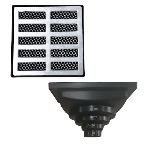 Ralo Pluvial Modelo 15x15 em Alumínio com Coletor de Plástico Saída Baixa Multiplas Saídas Adapt para tubo de 40mm, 50mm, 75mm e 100mm além de DUPLA proteção contra insetos