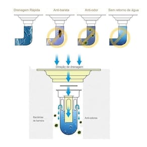 Suporta descarga de grande volume de água, o que pode bloquear o cabelo e impedir o entupimento dos canos de esgoto.