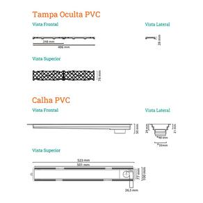 Especificações Gerais do Produto: Dimensões AxLxP (mm)1 Calha: 29x523x100mm; 2 Subtampas: 26x248x76mm cadaMaterial: Calha em PVC e Subtampa em PVCGarantia: 5 anos junto ao fabricanteReferência: 6084Formato: LinearCompatibilidade: Acoplável em caixas sifonadas de 100mm e de 150mm e compatível com tubo de 50mm (necessário o uso da bolsa acoplável da marca Novii - não incluso)Fecha Ralo (previne o retorno de insetos pela tubulação): SimModelo Oculto: A subtampa funciona como berço para acomodar uma tira de piso colada como acabamento final.Saída: Saída na ExtremidadeGrade Retentora (previne entupimentos na tubulação de esgoto): SimAbas para prevenir infiltrações: SimSugestão de Uso: Ideal para salas de banho e banheiros em geral.Base com altura reduzida: Permite a instalação apenas no contrapiso, sem precisar cortar a lajeQueda Interna: Sim (ajuda a água fluir naturalmente para saída do ralo)Tipo: SecoLocal de Uso: Interno O que vem na caixa:1 Calha do ralo de PVC2 Subtampas ocultas removíveis em PVC (26x248x76mm cada) (AxLxP)1 Fecha Ralo1 Grade Retentora