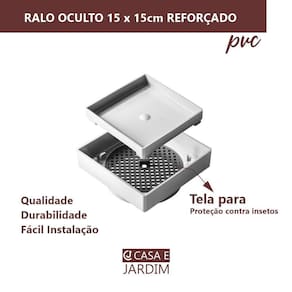 Características Técnicas: Acabamento: Ralo em PVC cor BRANCA Tampa com rebaixo para instalação de pisos e porcelanatos de 10mm de espessura. Instalar a cerâmica com argamassa. Medidas: 15x15cm. Altura: 4,5cm. Área de captação total: 1.400mm, Vazão 5000ml/min.