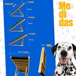 A Rampa para Pets é perfeita para garantir acessibilidade para o seu pet idoso ou debilitado! A Rampa possui três regulagens de altura, sendo perfeita para ser utilizada em sofás, camas ou até mesmo para auxiliar o cachorro a descer do carro! A Rampa também possui o diferencial de ser dobrável, facilitando no transporte.