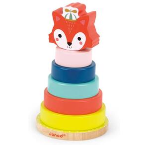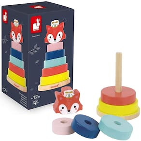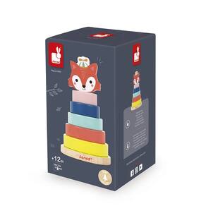 Com um design empilhável, a raposa é composta por 6 peças que podem ser organizadas no próprio ritmo da criança, guiadas pelas cores presentes na haste central.