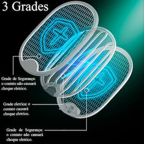 Conta com sistema de proteção anti - choque, com 3 grades, 2 grades externas de segurança que não causam choque ao contanto, evitando acidentes, além de contar com eliminação inteligente de energia residual, que elimina a energia da grade central automaticamente após 5 segundos do desligamento da Raquete.