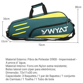 Raqueteira para esportes - beach tennis / padel / badminton / tênis / squash - a prova de água impermeável - resistente - durável - com alça para ombro - 2 compartimentos bolso lateral Perfeito para transportar seus equipamentos e acessórios com total conforto, organização e segurança. Parceira perfeita de viagem. Raqueteira com compartimento bolso lateral para seus eletrônicos e acessórios, espaço interno acolchoado para raquetes, repartição interna para roupas, toalhas, etc. Costuras reforçadas e acabamento impecável. Você pode colocar 3 raquetes no compartimento, assegurando que a tecnologia de controle climático cct + no interior mantenha suas raquetes protegidas do calor. A alça de ombro ajustável permite flexibilidade ao viajar ou transportar, enquanto o bolso interno e externo permitem acesso rápido a tudo o que você precisa. Características: - design moderno - alça ajustável - alta qualidade, profissional, durável - recomendado para todos esportes com raquetes - capacidade para transportar de 3 raquetes + acessórios - utilizada para raquetes de badminton, tennis, beach tennis, squash, etc. - ideal para atletas profissionais ou amadores que desejam transportar suas raquetes com segurança. Informações técnicas: Material externo: fibra de poliéster - impermeável Material interno: nylon - alta resistencia Forro: acolchoado Peso aproximado: 500 g Comprimento: 72 cm Largura: 11 cm Altura: 30 cm Cor: verde Capacidade: 3 raquetes + 1 conjunto uniforme + 1 par calçados + 1 toalha + 1 tubo de bolas + 1 garrafa de água do fabricante: contra defeito de fabricação 90 dias Origem: Itens inclusos: - 1 raqueteira bolsa ywyat completa conforme descrição acima