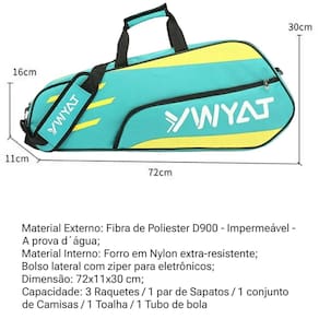 Raqueteira para esportes - beach tennis / padel / badminton / tênis / squash - a prova de água impermeável - resistente - durável - com alça para ombro - 2 compartimentos bolso lateral Perfeito para transportar seus equipamentos e acessórios com total conforto, organização e segurança. Parceira perfeita de viagem. Raqueteira com compartimento bolso lateral para seus eletrônicos e acessórios, espaço interno acolchoado para raquetes, repartição interna para roupas, toalhas, etc. Costuras reforçadas e acabamento impecável. Você pode colocar 3 raquetes no compartimento, assegurando que a tecnologia de controle climático cct + no interior mantenha suas raquetes protegidas do calor. A alça de ombro ajustável permite flexibilidade ao viajar ou transportar, enquanto o bolso interno e externo permitem acesso rápido a tudo o que você precisa. Características: - design moderno - alça ajustável - alta qualidade, , durável - recomendado para todos esportes com raquetes - capacidade para transportar de 3 raquetes + acessórios - utilizada para raquetes de badminton, tennis, beach tennis, squash, etc. - ideal para atletas profissionais ou amadores que desejam transportar suas raquetes com segurança. Informações técnicas: Material externo: fibra de poliéster - impermeável Material interno: nylon - alta resistencia Forro: acolchoado Peso aproximado: 500 g Comprimento: 72 cm Largura: 11 cm Altura: 30 cm Cor: verde-água com amarelo Capacidade: 3 raquetes + 1 conjunto uniforme + 1 par calçados + 1 toalha + 1 tubo de bolas + 1 garrafa de água do fabricante: contra defeito de fabricação 90 dias Origem: Itens inclusos: - 1 raqueteira bolsa ywyat completa conforme descrição acima