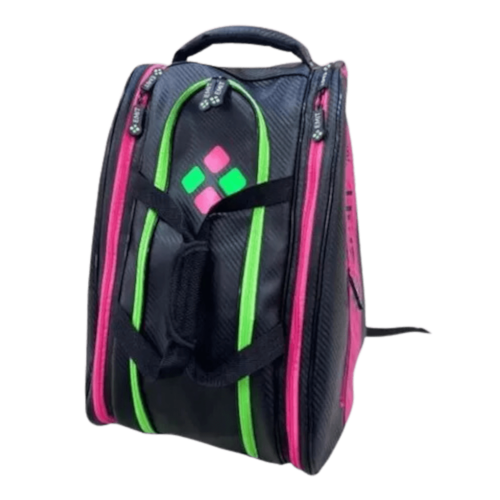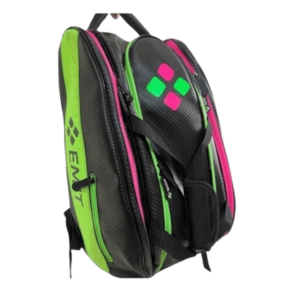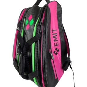 A bolsa, confeccionada por uma artesã em tecido sintético com aparência em carbono 3k, oferece fácil limpeza e durabilidade. Possui dois compartimentos laterais com proteção térmica, permitindo armazenar duas raquetes em cada lado. O compartimento central é espaçoso, adequado para guardar vestuário, raquetes extras e outros pertences pessoais, além de contar com quatro compartimentos grandes com zíper. Há também um compartimento interno separado para calçados ou roupas usadas, garantindo praticidade e organização. Dois bolsos laterais com zíper proporcionam espaço adicional para acessórios. Para transporte, a bolsa possui alça de mão reforçada e acolchoada, permitindo carregá-la tanto na vertical quanto na horizontal. As alças das costas são ajustáveis e acolchoadas em Easy Air, proporcionando maior ventilação e conforto durante o uso. O apoio das costas também é confeccionado em Easy Air, garantindo uma experiência de transporte agradável em todas as situações.
