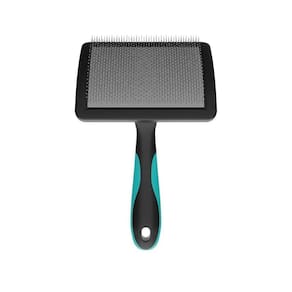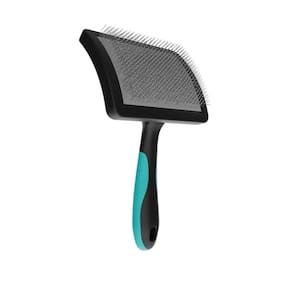 A Rasqueadeira Curva Grande com Bolinhas - Propetz possui pinos em aço inoxidável flexíveis e com a ponta protegida com pinos emborrachados que proporcionam uma massagem agradável na pele do animal, sem risco de arranhar, além de alisar o pelo.