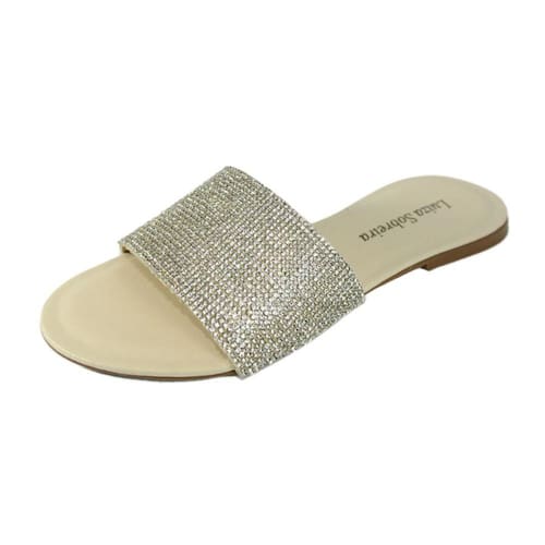 Linha de Rasteira Luiza Sobreira, produzida em material sintético na cor Off White, bico redondo, detalhes em strass, com palmilha e forro em P.U., solado em TR. Produto leve, versátil e confortável para você. (No tamanho 38): A altura do salto é de 1 cm.