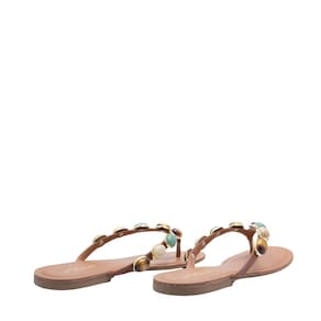 Esta Rasteira Unique é o complemento ideal para looks leves e naturais do verão. Confeccionada em material na cor caramelo com tiras que se unem no centro, ela se destaca pelos aplicações de pedras coloridas e naturais  que adornam a parte superior. O design minimalista e o solado fino proporcionam um visual delicado e confortável, perfeito para adicionar um toque de cor e sofisticação aos seus passeios diários.