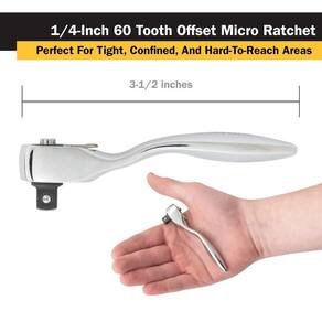 Titan 11204 1/10.2 cm x 3-1/5.1 cm 60 dentes offset micro catraca - Unidade de 1/10.2 cm | Comprimento total de 8,5 cm - Estrutura de cromo-vanádio para durabilidade e resistência | alça ergonômica e offset oferece maior conforto e controle - O mecanismo de catraca reversível de 60 dentes produz uma varredura mínima de 6 graus - perfeita para áreas apertadas, confinadas e difíceis de alcançar - O recurso de liberação rápida segura o soquete e permite fácil remoção - Feito em Taiwan
