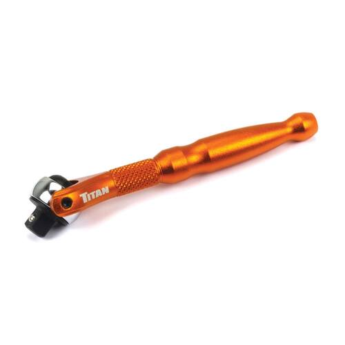 Titan Ferramentas 11322 1/10.2 cm Drive x 10.2 cm Cabeça giratória 90 dentes Micro catraca - Laranja - Unidade de 1/10.2 cm | comprimento total: 10 cm - A cabeça de catraca feita de liga de cromo vanádio e a alça são feitas de alumínio anodizado - O mecanismo de catraca reversível de 90 dentes produz uma varredura mínima de 4 graus - perfeita para áreas apertadas, confinadas e difíceis de alcançar - A cabeça giratória redonda gira em uma faixa de 252 graus para vários ângulos de acionamento | Possui uma parte serrilhada na alça que oferece aderência e controle - Feito em Taiwan