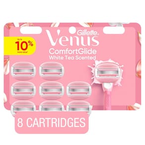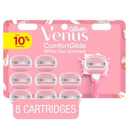 Venus Lâminas de barbear femininas ComfortGlide White Tea, com barras de gel de barbear embutidas, 8 refis de lâmina de barbear - Barras de gel de barbear 2 em 1: o barbeador ComfortGlide Venus ensaboa e faz a barba em cada golpe - sem necessidade de creme de barbear! - Aroma de chá branco: transforma sua rotina de barbear em uma experiência refrescante - 3 lâminas para um barbear rente: a tira de lubrificação desliza sobre a pele para ajudar a proteger da irritação do barbear - O refil serve para todas as alças de Venus : estes refis de lâmina de barbear se encaixam em qualquer cabo Venus (exceto Simply Venus e Venus para pelos pubianos e pele) - Fácil e sem esforço: ideal para barbeadores de primeira viagem e para quem procura uma suavidade diária para até 30 dias de barbear com base em barbear 2x/semana.
