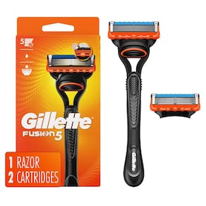 Barbeador Gillette Fusion5 para homens, alça mais de 2 recargas de lâmina de barbear — barbear mais próximo e duradouro: este barbeador masculino possui 5 lâminas antifricção. (versus Mach3) - 1 RECARGA DE LÂMINA = 18 BARBEAÇÕES. Barbeie até 18 vezes com cada recarga de lâmina Fusion5 - FAIXA DE LUBRIFICAÇÃO PARA DESLIZAR: A faixa de lubrificação fornece lubrificação após as lâminas e proporciona um deslizamento suave enquanto você se barbeia - ALÇA OTIMIZADA PARA SEU CONFORTO: com uma alça de barbear renovada para máximo conforto - APARADOR DE PRECISÃO: obtenha um barbear bem esculpido com o aparador de precisão na parte traseira
