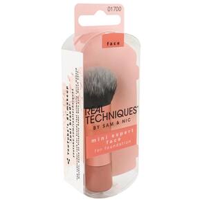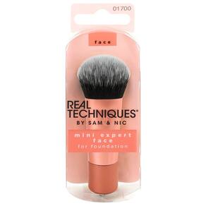 Pincel para base em miniatura. Real Techniques Mini Expert Face Brush permite uma aplicação uniforme de bases líquidas ou cremosas devido às cerdas firmes, concentradas e sintéticas. Proporciona um acabamento natural, além de fazer com que o produto tenha boa aderência à pele.