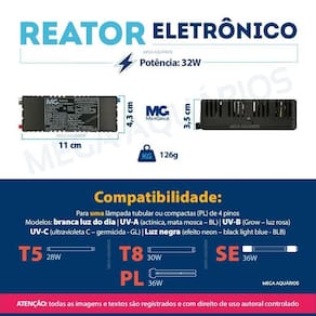 Reator eletrônico margirius para ligar uma lâmpada tubular ultravioleta uvc uva uvb germicida, actínica, grow, luz negra ou branca luz do dia comum fluorescente de 32wOs reatores eletrônicos da margirius são os mais indicados para as lâmpadas ultravioletas germicida, actínica, grow, luz negra ou para lâmpadas comuns de quatro pinos. São de fácil instalação e geram uma economia de 30% em comparação aos reatores eletromagnéticos.Características:Indústria nacional SeguroCompactoModelo ideal para ligar lâmpada ultravioleta germicidaReator eletrônico para acender uma lâmpadaPara lâmpada de 4 pinos fluorescentePartida instantânea30% mais econômico em relação aos modelos eletromagnéticosMaior eficiência e durabilidade para as lâmpadasNão é a prova dágua.Compatibilidade:Modelos de lâmpadas: t5 t8 t10 t12 se plQuantidade de pinos na lâmpada: 4Potência da lâmpada: 28w 30w 32w 36wTipos de lâmpadas:Comum e ultravioletas:Branca luz do diaUva actínica, mata mosca - bl Uvb grow - luz rosa Uvc ultravioleta c - germicida - gl Luz negra efeito neon - black light blue - blb .Especificações:Fabricante: margiriusModelo: pg - 1x32 af3Voltagem: pode ser ligado em 110v ou 220vDimensões: 11 x 3,5 x 4,3cm larg x alt x profundidadePeso: 126gCorrente: 0,29a 127v / 0,17a 220v Potência: 35w 127v / 35w 220v Temperatura máxima de trabalho: 75c.Observações e precauções:A instalação deve ser feita por um profissional especializadoInstalar o reator conforme o esquema de ligação gravado no corpo do produto;Isolar corretamente o fio não utilizadoTrocar a s lâmpada s somente com o reator desligadoNão instalar o reator em ambientes úmidos, sujeito a intempéries ou em locais em que a temperatura ambiente seja inferior a 10ºc ou superior a 45ºc;Não recomendamos aumentar o comprimento dos cabos da s lâmpada s por mais de 2 metros, bem como enrolá-los ou trançá-los entre si ou com outros cabos.Obrigado pela visita e boas comprasAtençãoNossas imagens e textos são registrados e com direito de uso autoral controlado e reservado a essa loja e as lojas parceiras devidamente autorizadas em contrato.