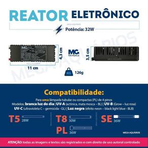 Reator eletrônico margirius para ligar uma lâmpada tubular ultravioleta uvc uva uvb germicida, actínica, grow, luz negra ou branca luz do dia comum fluorescente de 32wOs reatores eletrônicos da margirius são os mais indicados para as lâmpadas ultravioletas germicida, actínica, grow, luz negra ou para lâmpadas comuns de quatro pinos. São de fácil instalação e geram uma economia de 30% em comparação aos reatores eletromagnéticos.Características:Indústria nacional SeguroCompactoModelo ideal para ligar lâmpada ultravioleta germicidaReator eletrônico para acender uma lâmpadaPara lâmpada de 4 pinos fluorescentePartida instantânea30% mais econômico em relação aos modelos eletromagnéticosMaior eficiência e durabilidade para as lâmpadasNão é a prova dágua.Compatibilidade:Modelos de lâmpadas: t5 t8 t10 t12 se plQuantidade de pinos na lâmpada: 4Potência da lâmpada: 28w 30w 32w 36wTipos de lâmpadas:Comum e ultravioletas:Branca luz do diaUva actínica, mata mosca - bl Uvb grow - luz rosa Uvc ultravioleta c - germicida - gl Luz negra efeito neon - black light blue - blb .Especificações:Fabricante: margiriusModelo: pg - 1x32 af3Voltagem: pode ser ligado em 110v ou 220vDimensões: 11 x 3,5 x 4,3cm larg x alt x profundidadePeso: 126gCorrente: 0,29a 127v / 0,17a 220v Potência: 35w 127v / 35w 220v Temperatura máxima de trabalho: 75c.Observações e precauções:A instalação deve ser feita por um profissional especializadoInstalar o reator conforme o esquema de ligação gravado no corpo do produto;Isolar corretamente o fio não utilizadoTrocar a s lâmpada s somente com o reator desligadoNão instalar o reator em ambientes úmidos, sujeito a intempéries ou em locais em que a temperatura ambiente seja inferior a 10ºc ou superior a 45ºc;Não recomendamos aumentar o comprimento dos cabos da s lâmpada s por mais de 2 metros, bem como enrolá-los ou trançá-los entre si ou com outros cabos.Obrigado pela visita e boas comprasAtençãoNossas imagens e textos são registrados e com direito de uso autoral controlado e reservado a essa loja e as lojas parceiras devidamente autorizadas em contrato.