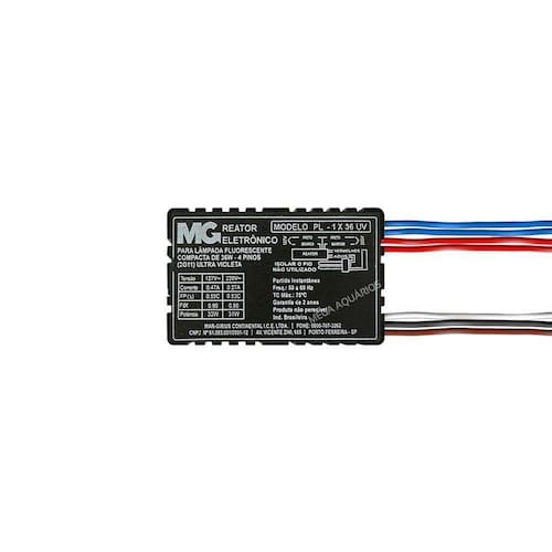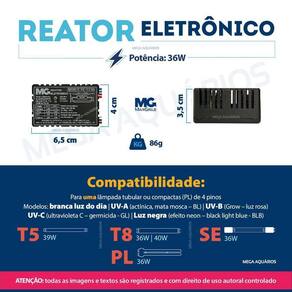 Reator eletrônico margirius para ligar uma lâmpada tubular ultravioleta uvc uva uvb germicida, actínica, grow, luz negra ou branca luz do dia comum fluorescente de 36wOs reatores eletrônicos da margirius são os mais indicados para as lâmpadas ultravioletas germicida, actínica, grow, luz negra ou para lâmpadas comuns de quatro pinos. São de fácil instalação e geram uma economia de 30% em comparação aos reatores eletromagnéticos.Características:Indústria nacional SeguroCompactoModelo ideal para ligar lâmpada ultravioleta germicidaReator eletrônico para acender uma lâmpadaPara lâmpada de 4 pinos fluorescentePartida instantânea30% mais econômico em relação aos modelos eletromagnéticosMaior eficiência e durabilidade para as lâmpadasNão é a prova dágua.Compatibilidade:Modelos de lâmpadas: t5 t8 t10 t12 se plQuantidade de pinos na lâmpada: 4Potência da lâmpada: 36w 39w 40wTipos de lâmpadas:Comum e ultravioletas:Branca luz do diaUva actínica, mata mosca - bl Uvb grow - luz rosa Uvc ultravioleta c - germicida - gl Luz negra efeito neon - black light blue - blb .Especificações:Fabricante: margiriusModelo: pg - 1x36 uvVoltagem: pode ser ligado em 110v ou 220vDimensões: 6,5 x 3,5 x 4cm larg x alt x profundidadePeso: 86gCorrente: 0,47a 127v / 0,27 220v Potência: 33w 127v / 31w 220v Temperatura máxima de trabalho: 75c.Observações e precauções:A instalação deve ser feita por um profissional especializadoInstalar o reator conforme o esquema de ligação gravado no corpo do produto;Isolar corretamente o fio não utilizadoTrocar a s lâmpada s somente com o reator desligadoNão instalar o reator em ambientes úmidos, sujeito a intempéries ou em locais em que a temperatura ambiente seja inferior a 10ºc ou superior a 45ºc;Não recomendamos aumentar o comprimento dos cabos da s lâmpada s por mais de 2 metros, bem como enrolá-los ou trançá-los entre si ou com outros cabos.Obrigado pela visita e boas comprasAtençãoNossas imagens e textos são registrados e com direito de uso autoral controlado e reservado a essa loja e as lojas parceiras devidamente autorizadas em contrato.