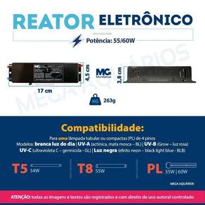 Especificações: Fabricante: margirius Modelo: pg - 1x55/60 uv Voltagem: pode ser ligado em 110v ou 220v Dimensões: 17 x 3,8 x 4,5cm larg x alt x profundidade Peso: 263g Corrente: 0,77a 127v / 0,46a 220v Potência: 58w 127v / 63w 220v Temperatura máxima de trabalho: 75c.