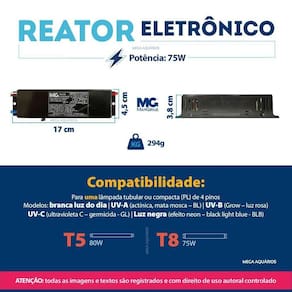 Reator eletrônico margirius para ligar uma lâmpada tubular ultravioleta uvc uva uvb germicida, actínica, grow, luz negra ou branca luz do dia comum fluorescente de 75wOs reatores eletrônicos da margirius são os mais indicados para as lâmpadas ultravioletas germicida, actínica, grow, luz negra ou para lâmpadas comuns de quatro pinos. São de fácil instalação e geram uma economia de 30% em comparação aos reatores eletromagnéticos.Características:Indústria nacional SeguroCompactoModelo ideal para ligar lâmpada ultravioleta germicidaReator eletrônico para acender uma lâmpadaPara lâmpada de 4 pinos fluorescentePartida instantânea30% mais econômico em relação aos modelos eletromagnéticosMaior eficiência e durabilidade para as lâmpadasNão é a prova dágua.Compatibilidade:Modelos de lâmpadas: t8 t10 t12 se plQuantidade de pinos na lâmpada: 4Potência da lâmpada: 75w 80w Tipos de lâmpadas:Comum e ultravioletas:Branca luz do diaUva actínica, mata mosca - bl Uvb grow - luz rosa Uvc ultravioleta c - germicida - gl Luz negra efeito neon - black light blue - blb .Especificações:Fabricante: margiriusModelo: pg - 1x75 uvVoltagem: pode ser ligado em 110v ou 220vDimensões: 17 x 3,8 x 4,5cm larg x alt x profundidadePeso: 294gCorrente: 0,70a 127v / 0,42a 220v Potência: 72w 127v / 68w 220v Temperatura máxima de trabalho: 75c.Observações e precauções:A instalação deve ser feita por um profissional especializadoInstalar o reator conforme o esquema de ligação gravado no corpo do produto;Isolar corretamente o fio não utilizadoTrocar a s lâmpada s somente com o reator desligadoNão instalar o reator em ambientes úmidos, sujeito a intempéries ou em locais em que a temperatura ambiente seja inferior a 10ºc ou superior a 45ºc;Não recomendamos aumentar o comprimento dos cabos da s lâmpada s por mais de 2 metros, bem como enrolá-los ou trançá-los entre si ou com outros cabos.Obrigado pela visita e boas comprasAtençãoNossas imagens e textos são registrados e com direito de uso autoral controlado e reservado a essa loja e as lojas parceiras devidamente autorizadas em contrato.