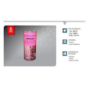 REAVIVANTE GREZZO 1 L BELLINZONI FinalidadeSe você deseja valorizar a cor da sua pedra, o Grezzo é o produto ideal. Ele é responsável por gerar um efeito molhado na superfície onde é aplicado. Além de reavivar a cor do material, ele ainda age como protetor, dificultando a entrada de água e óleo na pedra.Instruções de UsoAgitar bem antes do uso. Em materiais polidos, aplicar uma demão uniforme, utilizando flanela ou rolo de espuma e aguardar a secagem. Após 30 minutos aproximadamente, puxar o brilho com uma flanela limpa. Em materiais brutos, muito porosos, pode ser necessário o emprego de mais uma demão, após duas horas, para acentuar a coloração. A cura total do produto ocorre 24 horas após sua aplicação.