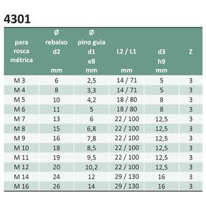 MEDIDAS DO REBAIXADORPara Rosca Métrica M 10;d2 - Diâmetro do Rebaixo: 18mm;d1 - Diâmetro do Pino Guia (diâmetro interno da rosca): 8,5mm;L2 - Comprimento do Corte: 22mm;L1 - Comprimento Total: 100mm;d3 - Diâmetro da Haste: 12,5mm;Z - Número de Cortes: 3.