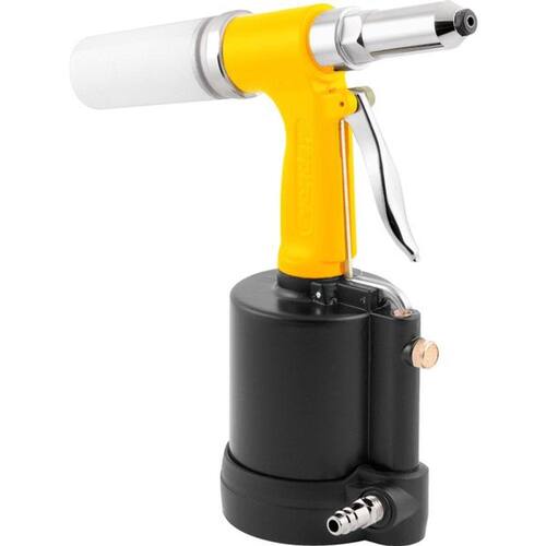 Uso industrial Para uso de rebites de rebites de alumínio até 4,8mm 3/16 e rebites de inox até 4,0mm 5/32 . Pressão maxima de trabalho de 90lbf/pol²/6,3 kgf/cm². Consumo de ar de 1,5 litros por minuto 0,05 pés³por minuto por acionamento do gatilho. Rosca de entrada de ar de 1/4 npt interna fêmea . Indicado para unir peças, como: chapas, tubos, perfis, entre outros, através de rebites de repuxo. Muito utilizado em linhas de produção. Quantidade de óleo hidráulico que vai dentro do rebitador: 25 ml. Agiliza o processo de rebitagem, garantindo maior produtividade com menor esforço ao operador, além de possuir reservatório, que coleta o mandril do rebite após a utilização, conferindo maior limpeza e segurança no ambiente de trabalho. Possui ainda filtro de ruído, que proporciona maior conforto ao operador. Ean: 7893946122690