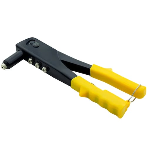 O rebitador possui corpo em aço e cabo emborrachado, uma ferramenta utilizada para unir, de maneira segura, componentes e chapas dos mais variados materiais por meio de rebites.