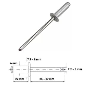 Produto: Rebite Pop de Repuxo em Alumínio Modelo: 422Cabeça abaulada Medidas: 5/32 x 22 4,0m x 22mm Vide foto com detalhes. Acabamento: Natural Quantidade: 500 peças.