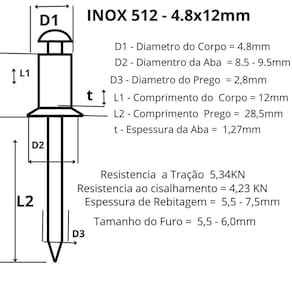 Rebite POP de Repuxo Inox A2 512 4.8 x 12 corpo em aço inox 304 e mandril tambem em aço inox 304