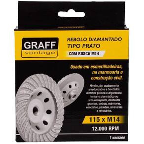 Marca: Graff Vantage Rebolo Diamantado Tipo Prato com rosca M14. Indicado para nivelar, dar acabamentos, remover pinturas e argamassa, desbastar granitos, pedras, mármores, concretos, paredes, alvenarias e refratários. Marca: Graff