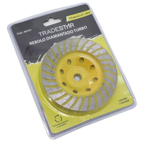 Rebolo diamantado, 115 mm, turbo Proporciona excelente acabamento Aplicações e dicas de uso: Indicado para desbaste em mármores, granito, concreto, pedras, entre outros. Utilizado em esmerilhadeiras de 4.1/2 - 115 mm. Velocidade periférica: 63 m/s conforme norma ABNT NBR 15545 . Características Técnicas: Diâmetro do rebolo: 4.1/2 - 115 mm Medida do encaixe do rebolo: Rosca M14 - MA Perfil de corte do rebolo diamantado: Turbo Espessura do corpo do rebolo diamantado: 9,0 mm Espessura da camada de diamante: 5,5 mm Altura da camada de diamante: 16,0 mm Rotação rpm : 10.500/min Conteúdo da Embalagem: 1 Rebolo diamantado TurboConfira algumas vantagens de comprar com a JJC FERRAMENTAS: