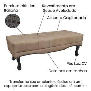 Os pés Luiz XV em madeira maciça elevam a elegância, enquanto as tachinhas em metal fumê adicionam um toque luxuoso e artesanal. Ideal para compor quartos, closets, halls de entrada ou até salas amplas, o Recamier Vicenza é a peça perfeita para transformar qualquer espaço em um ambiente requintado e acolhedor.
