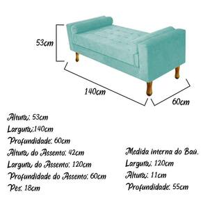 Com uma estrutura e beleza única, o Recamier Félix se adapta em qualquer ambiente, tornando-o ainda mais elegante e harmonioso. Um Recamier luxuoso de alta qualidade, dará um toque especial em seu ambiente. Não perca essa oportunidade de levar mais charme e requinte ao seu cômodo, adquira já o seu! Especificações Técnicas do Recamier Félix: - Altura: 53 cm; - Largura: 140 cm; - Profundidade: 60 cm; - Altura do Assento: 42 cm; - Largura do Assento: 120 cm; - Profundidade do Assento: 60 cm; - Altura dos Pés: 18 cm; - Peso: 35 kg. - Peso Suportado: 220 kg. Medida Interna do Baú: - Altura: 11 cm; - Largura: 120 cm; - Profundidade: 55 cm; Diferenciais do Recamier Félix: - Material da Estrutura: fabricado com Madeira Pinus e Eucalipto Reflorestada, e alguns detalhes em MDF; - Tipo de Assento: estofado e com espuma de densidade D-26; - Tipo de Encosto: estofado e com espuma de densidade D-18; - Detalhes do Tecido: possui detalhes em botonê, onde os botões são revestidos no mesmo tecido do produto e finalizados com excelente acabamento; - Detalhes dos Pés: acompanha kit de pés (4 pés) de madeira, no estilo Luís XV, com alta resistência; - Volumes: nessa compra você receberá um único produto. Recomendações de limpeza: -Limpar com flanela limpa e seca. Não molhar o móvel e não expor em lugar úmido ou próximo de fontes de calor. Não usar produtos abrasivos. Observações Importantes: - As imagens ambientadas são meramente ilustrativas e podem apresentar itens que não compõe o produto; - Objetos decorativos que aparecem na foto não acompanham o produto; - As cores do produto podem variar de acordo com o monitor, a iluminação do ambiente, ou sua percepção visual; - O Recamier Félix chegará montado para você, bastando rosquear os pés; - Confira as dimensões antes da compra e certifique-se de que o produto passará por elevadores, portas e corredores, já que nossa entrega não inclui a subida de lances de escada, ou o lançamento de produtos; - Ao receber seus produtos, verifique no ato do recebimento qualquer dano na embalagem. Caso tenha alguma avaria, favor não assinar o comprovante de recebimento (A transportadora tem obrigação de esperar a conferência); - Produto para uso residencial em ambiente interno, não devendo ficar exposto diretamente ao sol, calor e umidades excessivas.